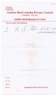 I have several memories of the permit regime including one of a beautiful "Wine Shop" called Govindarujulu and Sons (or something like that) on the corner of Nungambakam High Road and Valluvarkottam High Road in the space that eventually became Naga's Restaurant and is now Sangeetha's.
